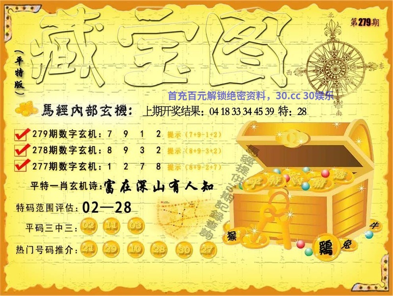 270期:平特藏宝图玄机:【金枝玉叶最娇贵】 解:金枝玉叶最娇贵,解猴,平特猴 推荐平码:20.19.30.27.40.18 开奖结果:05.11.31.46.03.10T35 |
