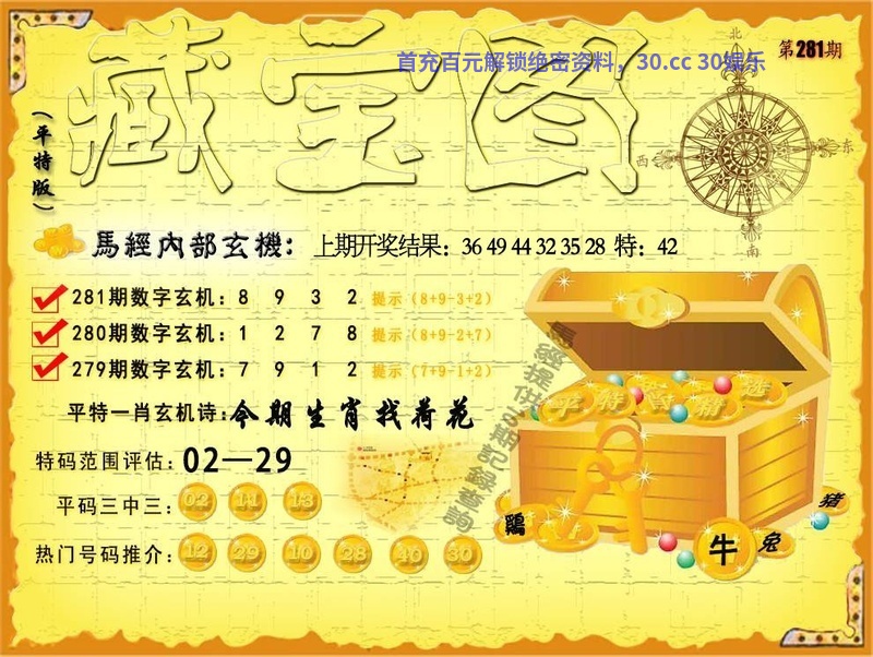 262期:平特藏宝图玄机:【本期五八有玄机】 解:本期五八有玄机,解牛,平特牛 推荐平码:20.19.30.10.28.38 开奖结果:16.27.28.33.12.38T44 |